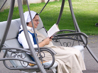 Sr. Deepa takes advantage of the beautiful weather by doing her study out on the swing.