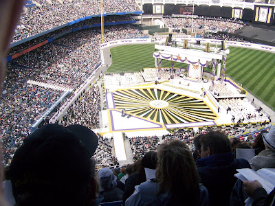 “Keep moving! Keep moving!” volunteers barked as we hopped onto one escalator and then the next. At the mezzanine we waved good bye to Sr. Mary Jeremiah who was seated with her sister. Would we ever see her again? We continued on, up…up….up…to the top tier! As we came out to the stands Sr. Veronica Marie informed up, “I’m scared of heights!” More climbing and we were at our seats: Tier 7, Section S. So high up we were nearly in heaven. But the view was perfect!