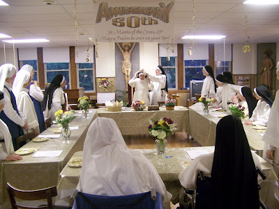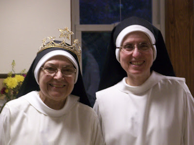 Jubilee Celebrations in our monastery always follow a tradition that goes back many years. The celebration actually begins the evening before at recreation. Our Jubilarian spends time in Choir while the rest of the community gathers (usually out of breath doing the 1000th last minute thing) in the community room. Our Sr. Mary Rose Dominic always writes a greeting song to a known hymn tune and everyone hastily tries to figure out if she even knows this "known" tune! Then, when all is ready, the prioress escorts Sister from the Choir to her place of honor (the bishop's chair) at the table. Then, she is crowned with either a silver or gold crown which, if truth be told, usually falls off until someone runs to get some pins! However, Sr. Maria must have the perfect head because hers stayed on!
