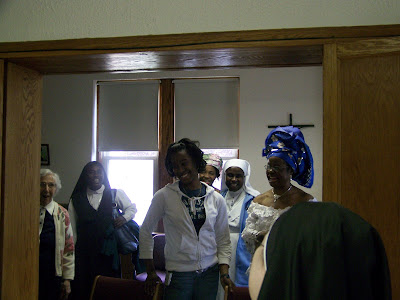 We always have a good crowd of Nigerians from Newark attend the Pilgrimage. Many dress in their colorful native dress to the delight of the Sisters who enjoying picking their fascinating headgear from out of the crowd.