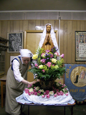 The Novitiate Sisters had the honor of decorating the Statue of Our Lady for the Rosary Pilgrimage. This statue, which looks very much like our Lady of Akita, but carved many years before the apparations, was designed by Sr. Maria of the Cross. This year the flowers and crown for our Lady were donated by several area florists.