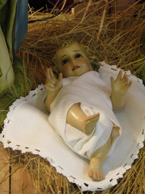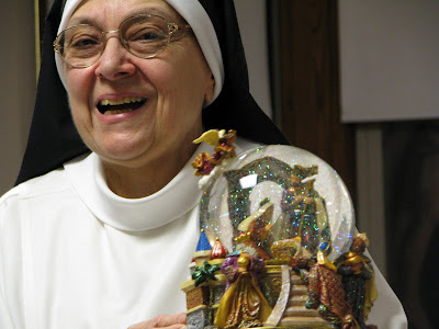 Look! A snow globe of the Nativity! No need to turn it upside down! Just push a button and it snows! Sisters have been seen all day walking by and making the globe snow.