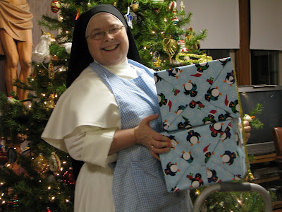At evening recreation we gather to open up our community presents. This is sometimes akin to a special at Filene's basement! Our New England readers will understand just what this means! The poor prioress is trying to write down who gave us what and meanwhile EVERYONE wants to see EVERYTHING! Sometimes we don't finish when the bell rings for Compline and that's OK. There's always tomorrow.