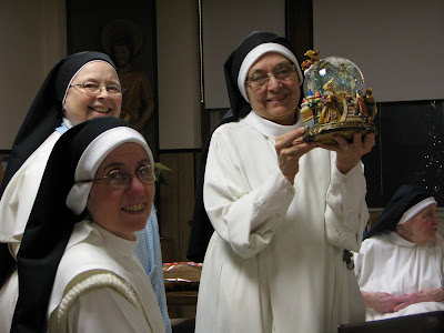 We don't exchange gifts but each sister has little gifts on her desk and a stocking prepared by the bursar. The "gift" that the sisters exchange is one of prayer. At the beginning of Advent each sister picks out a name from a basket and prays for her during the Advent season. We reveal our prayer partner at recreation (but we forgot this year. We'll have to remember tomorrow!) Opening and sharing or exchanging the contents of our stocking is a favorite activity. Some sisters wait until the morning to open gifts sent by their families and others open them as they come in since often the packages contain perishables.