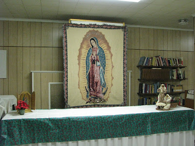 Just in time for today's feast of Our Lady of Guadalupe we received this beautiful wall hanging of her image from the Sisters, Slaves of the Immaculate Heart of Mary in Still River, MA. It now hangs in St. Dominic's Hall, our reception/lecture hall in the basement.