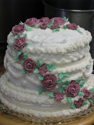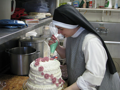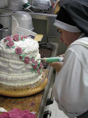Sr. Mary Catharine has been a bit nervous about it since it has been over 20 years since she last decorated a cake. Much to her amazement (and ours, too, as we were fascinated) last week Sister made the roses that would adorn the cake so that they could set in the freezer in order for her to handle them. The last time she made a rose? "When I was 15 or 16!" Obviously, age has its benefits because Sister admitted that it was easier now than when she was a teenager!