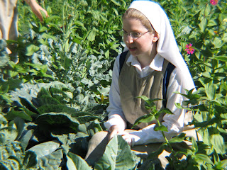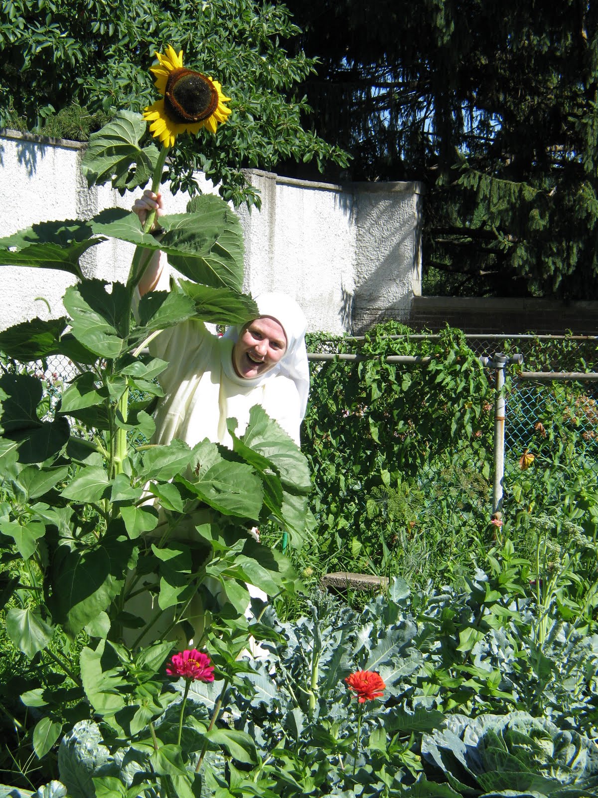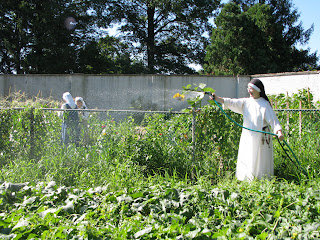 The gardens are loving the very hot and humid weather (as are the weeds!). The novitiate sisters planted 2 gardens, taking over part of Sr. Mary Martin's garden where she has her tomatoes and string beans. The first bunches of broccoli (yum!) are coming in and the zucchini is on the menu almost daily! We picked a few ears of corn last week. As you can see in the photo Sr. Mary Magdalene's sunflower is worthy of her Kansas touch. She also planted 3 papaya plants!