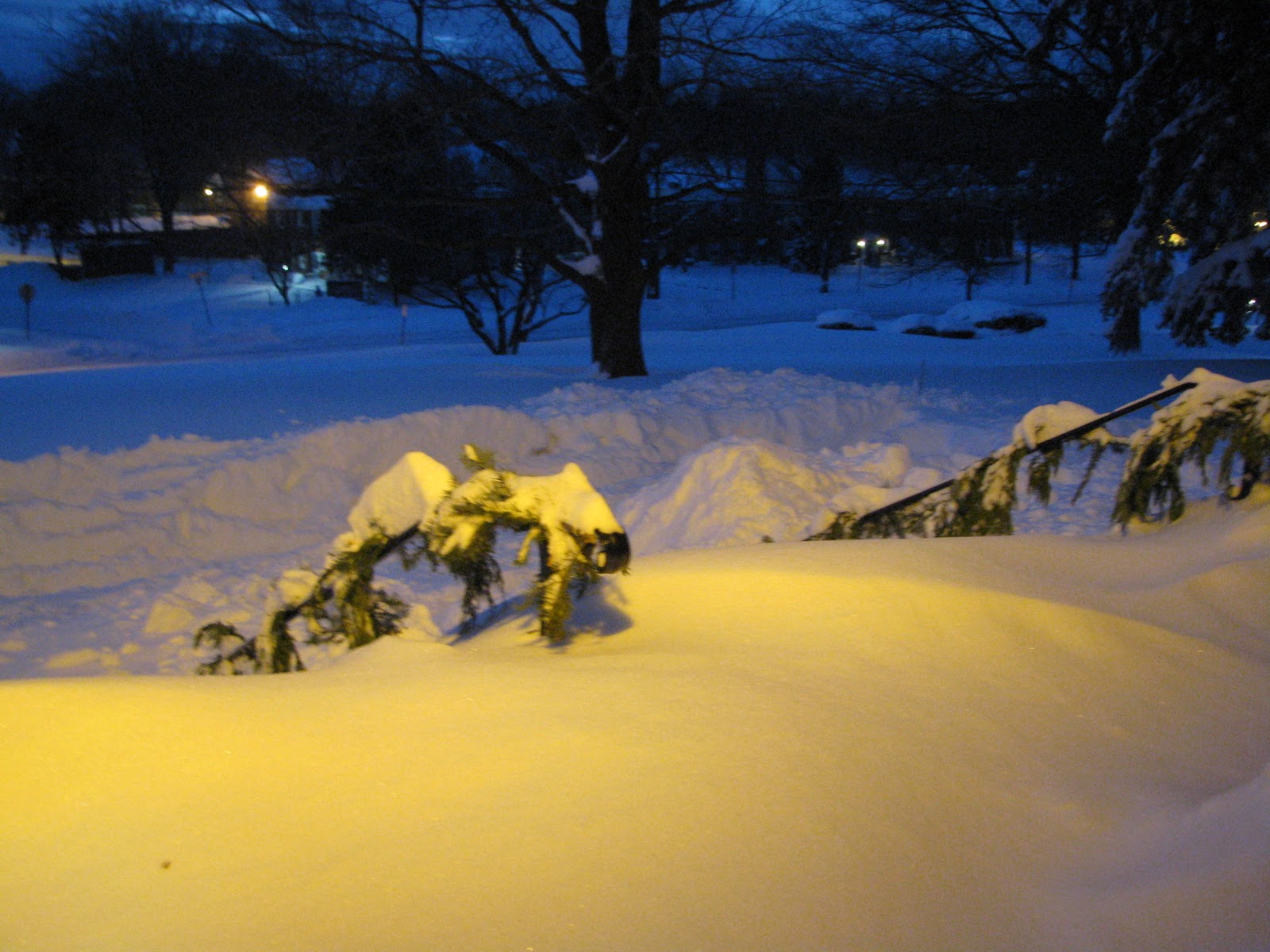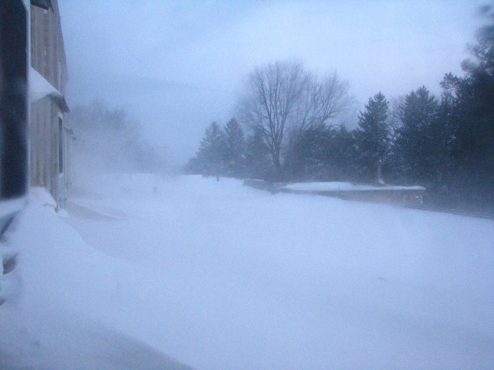 6:30 AM—We got the front chapel doors open about 5 inches. It was obvious that even if someone COULD make it up our hill, they sure couldn't get up the stairs or open the door! It's hard to tell by the drifts but from the official reports and from the picnic table and the cemetery it looks like we got about 2 feet of snow!