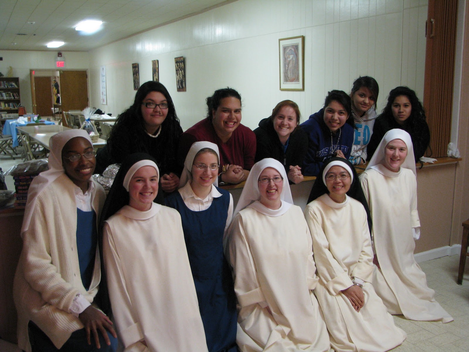 Tuesday, February 22nd, we had the privilege of hosting the St. Thomas the Apostle Parish Nun Run led by Deepa Kingry, who was once a novice here. Carmen,Yuri, Melissa, Gracie, and Jessica drove with Deepa from Georgia first stopping at to visit the Visitation Sisters in Washington, DC. They arrived right before Office of Readings and then spent the afternoon visiting the novitiate sisters (and Sabina) who found their visit a wonderful excuse to serve cookies and punch.