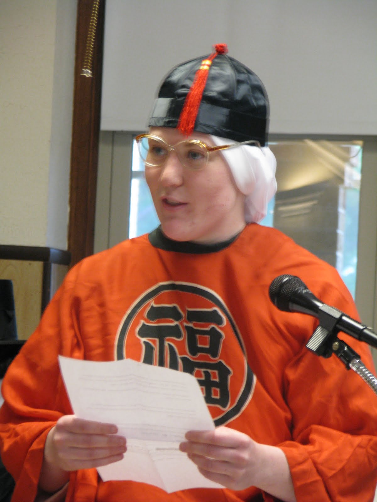 | Sr. Mary Magdalene narrates the skit/musical "The Call". Check out that crazy costume. |