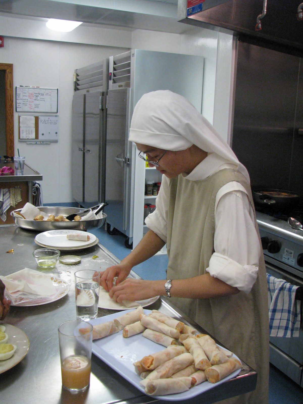 Sr. Mary Cecilia rolls dough for Fried Snickers!