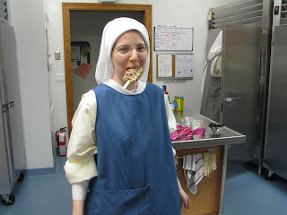 A sure sign that the novitiate was in the hot kitchen too long! Sr. Mary Veronica wasn't being humorous...she was trying to eat her Good Humor bar and work at the same time!
