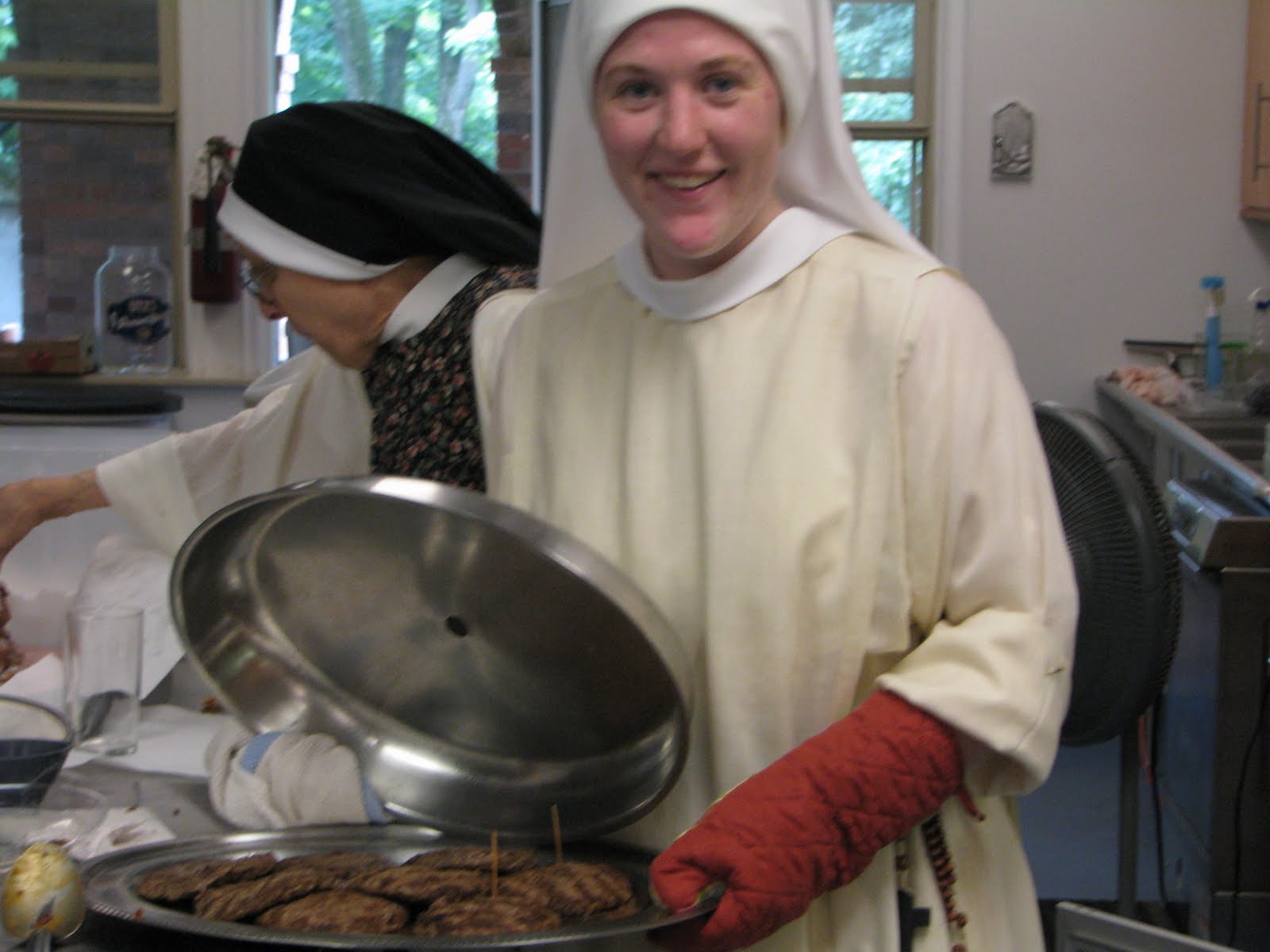 | Sr. Mary Magdalene did the grilling and shows off her work, while Sr. Maria grabs a sample in the background. |