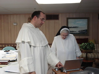 | Fr. Dominic shows Sr. Mary Sacred Heart the secret to viewing files through a digital projector! |