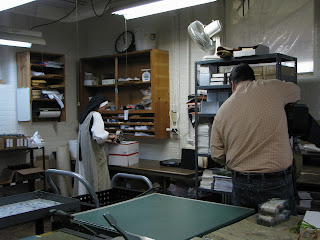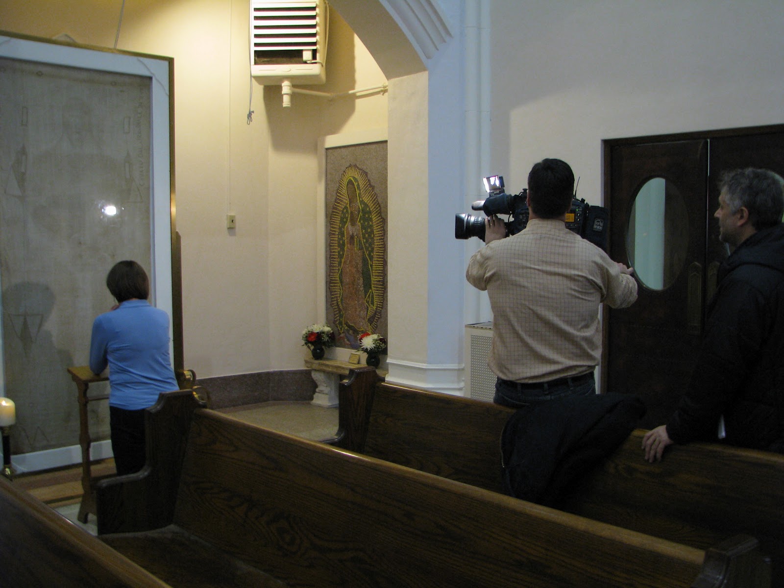 Then the camera crew filmed the Shroud while the two Laurens gathered data about the history of the Shroud copy and the scientific testing done on it in 1987. Our good friend and volunteer, Kathy Tafaro, just happened to walk in for a moment and she was cajoled into praying before the Shroud for the camera. "I do pray in front of it every time I come in," she assured us!