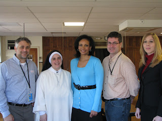 We admit it; we were nervous. Everyone was so friendly that in no time we felt quiet comfortable even if the big lens of a camera was aim at one or another of us. After they got all the shots they wanted of our soap making, packaging, etc. (no, they didn't stay to film the daily clean -up), the crew then interviewed Sr. Mary Catharine who seemed to be at home in front of a camera with a huge spotlight on her. She was grateful for Sr. Maria Teresa and Sr. Mary Cecilia hanging around in the background giving moral support!