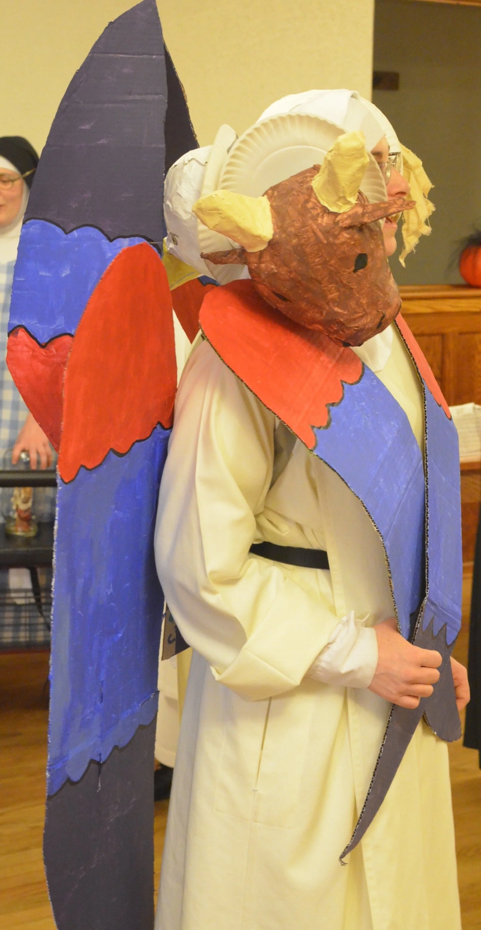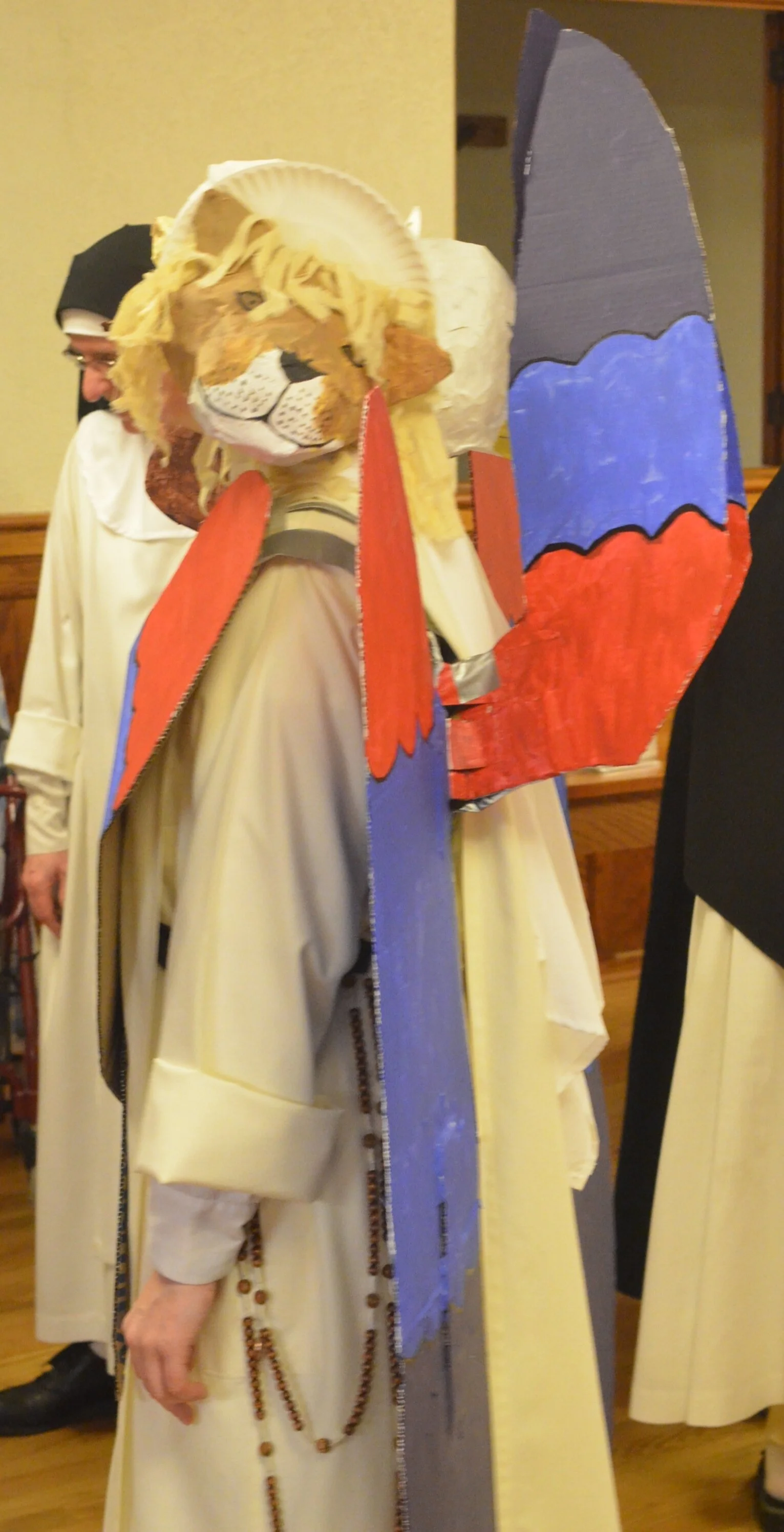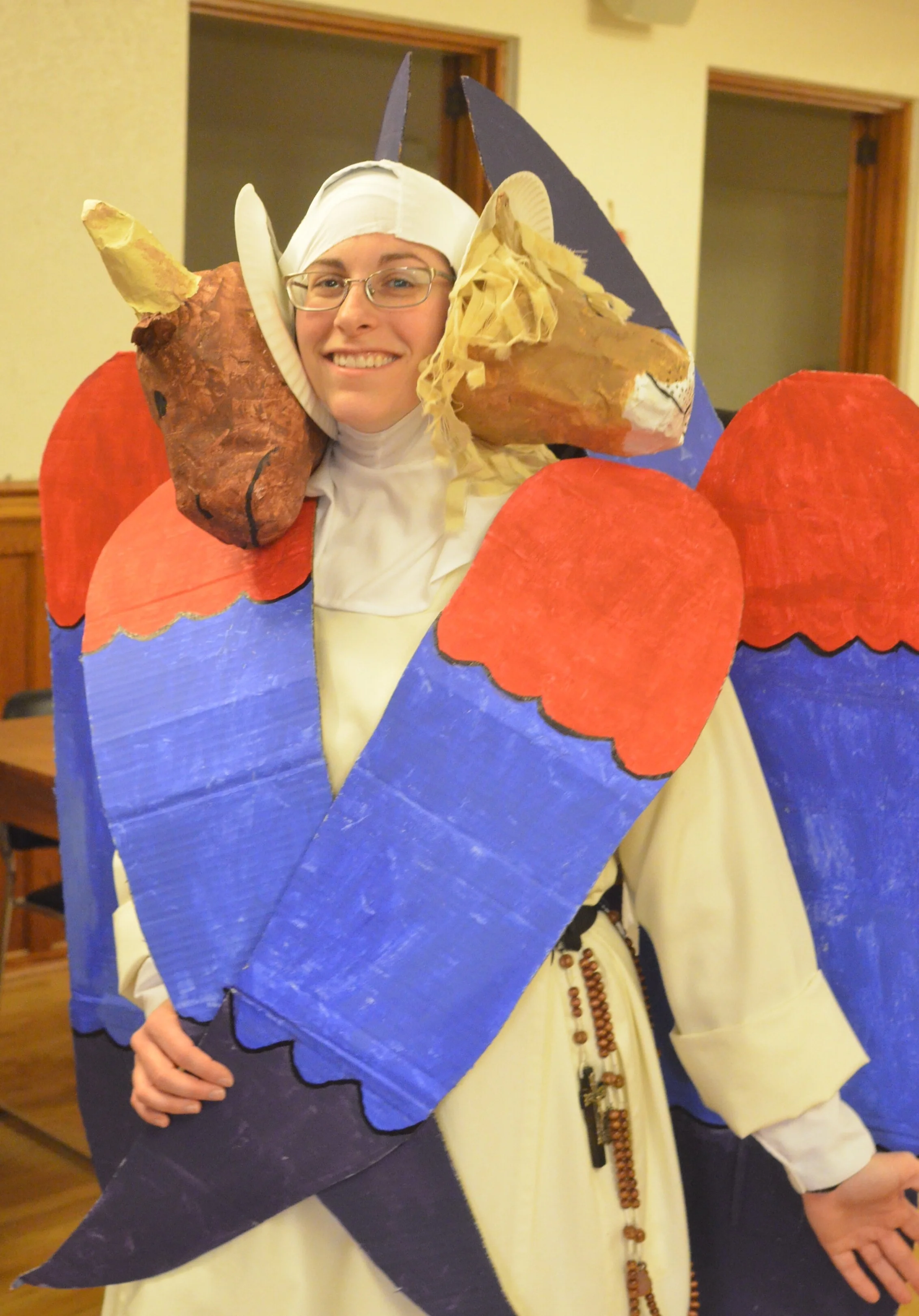Everyone remembers Sr. Mary Ana's famous "Postulant Barbie" from last year, so we were all anticipating another memorable costume. Sister did not disappoint! She created an elaborate costume depicting one of the Cherubim from Ezekiel's vision! (See the first Chapter of Ezekiel for a description.)