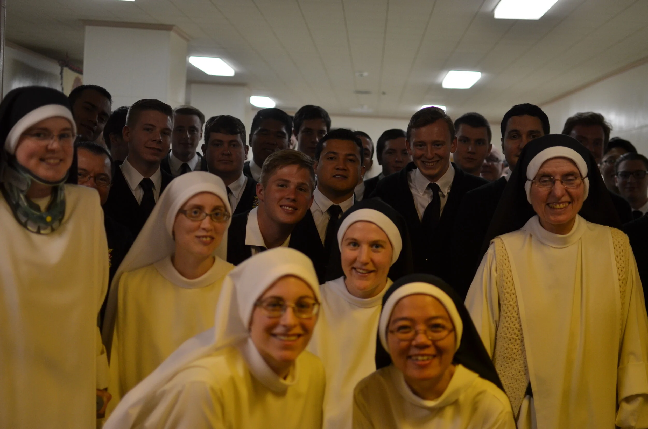 In the afternoon 30 minor seminarians from St. Andrews College Seminary at Seton Hall came for a parlor visit. The young men varied in age from 18-31 and were sponsored by 4 NJ dioceses (all but Trenton) as well as the diocese of Madison, Wisconsin. Two seminarians, the youngest and the oldest, shared their vocation stories and our prioress, Sr. Mary Martin, shared her vocation story with the seminarians. Questions were asked back and forth and before we knew it the bell had rung for Rosary and Vespers. Prayers were promised and pictures were taken before the seminarians headed up to the public chapel to join us for prayer.