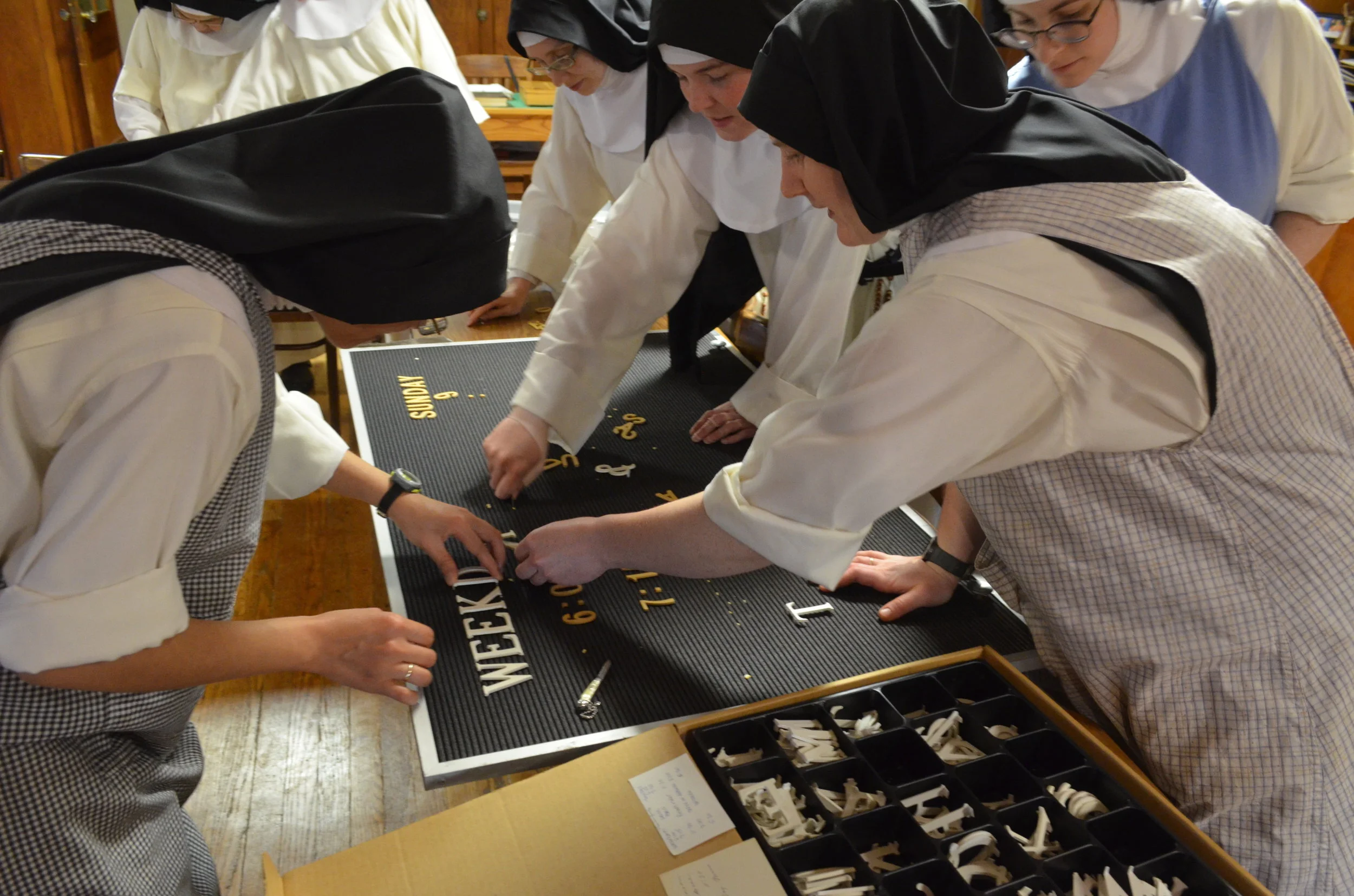 At evening recreation sisters crowded around the board, plucking out the fragile old yellow numbers with their pocket knives and figuring out a new arrangement. It was quite a project! Some letters were missing in one size and some in the other, most of the punctuation was missing as well. Once we had everything sorted we had a little fun making faces with the left over shapes and letters.