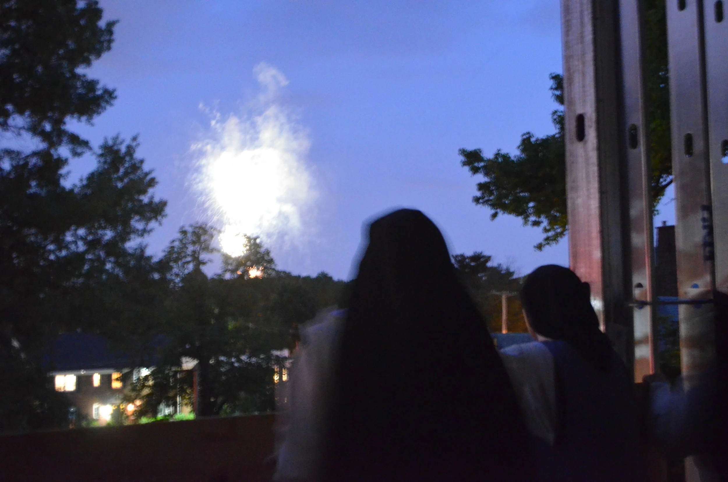 This year we had a new plan! While visiting the new wing as it has been going up, we realized it might give us a great view of the fireworks. So after Compline while the novitiate climbed to the roof another group of sisters walked over to what will be the guest area of the new wing. It was the perfect view for all the higher fireworks!