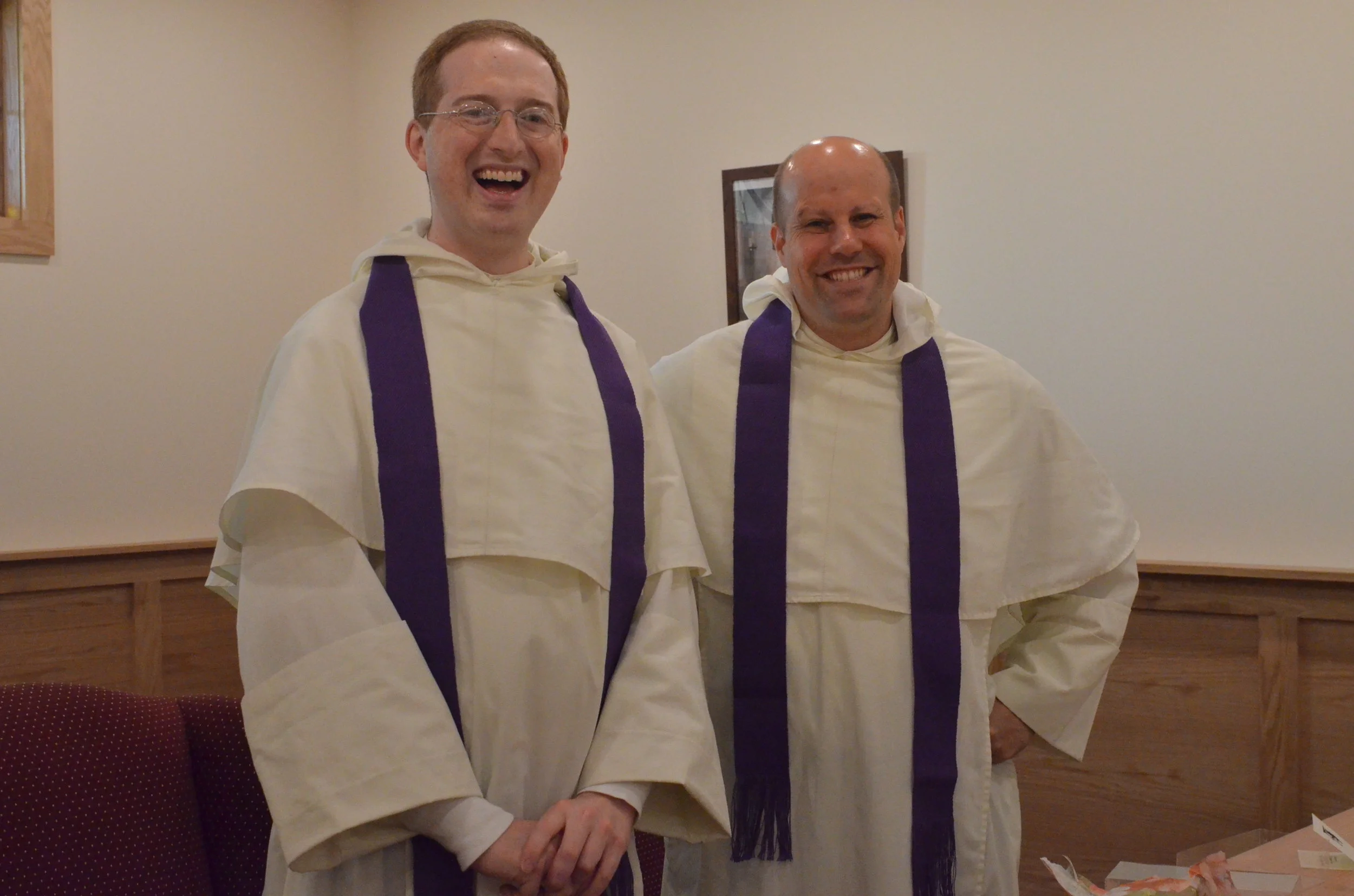 On June 3rd we had the joy of welcoming two brothers who were recently ordained and came to say Mass for us and give us their blessing. Fr. John Paul Kern, OP, and Fr. Joseph Martin Hagan, OP, of the St. Joseph Province of the Order of Preachers were ordained to the priesthood on May 25th along with four other friars. At the end of Mass Fr. John Paul and Fr. Joseph Martin gave us their blessings and then joined us in the parlor for a visit. As has become our custom, we gave them our handwoven confessional stoles as an ordination gift.