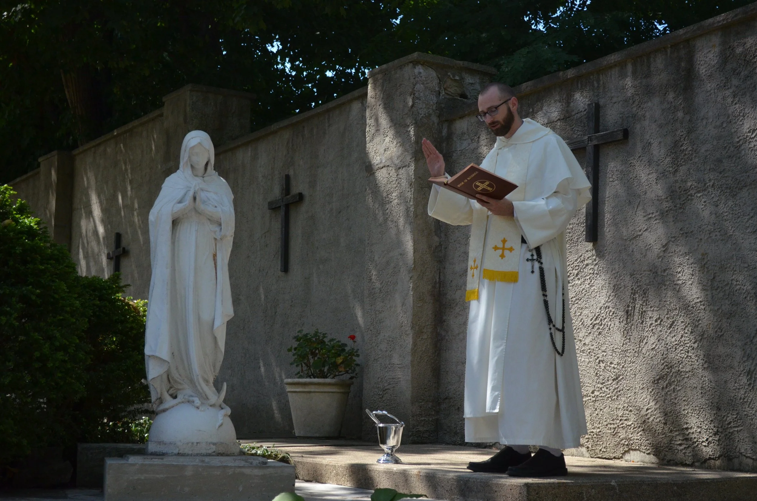 A beautiful statue of Our Lady was recently donated to us, so when newly ordained Fr. Damian Day, OP came on the Solemnity of the Assumption to offer a First Mass for us, we asked him if he would bless our statue, which was just installed in its new home. It is a lovely and graceful image of Our Lady, and now stands at the top of a terraced garden built into the bank along the side of the enclosure.